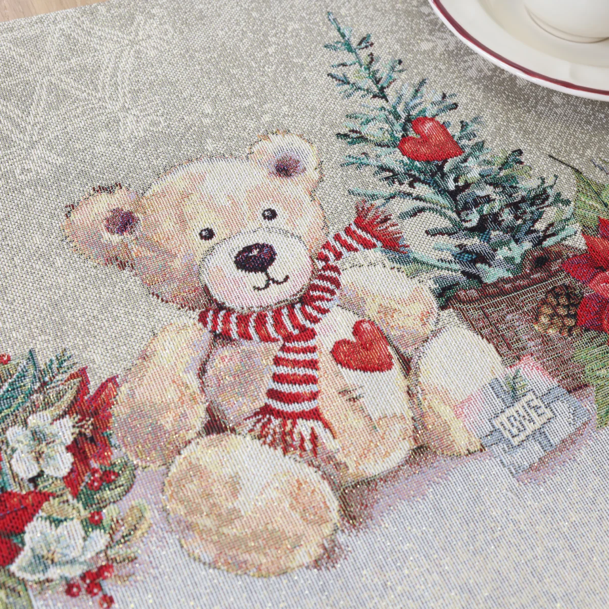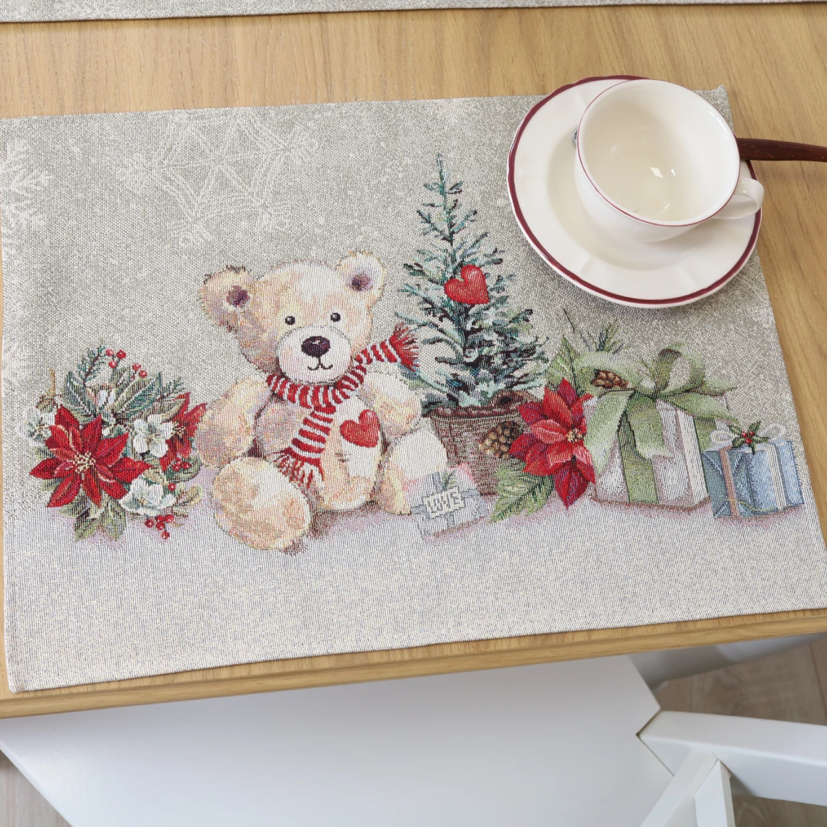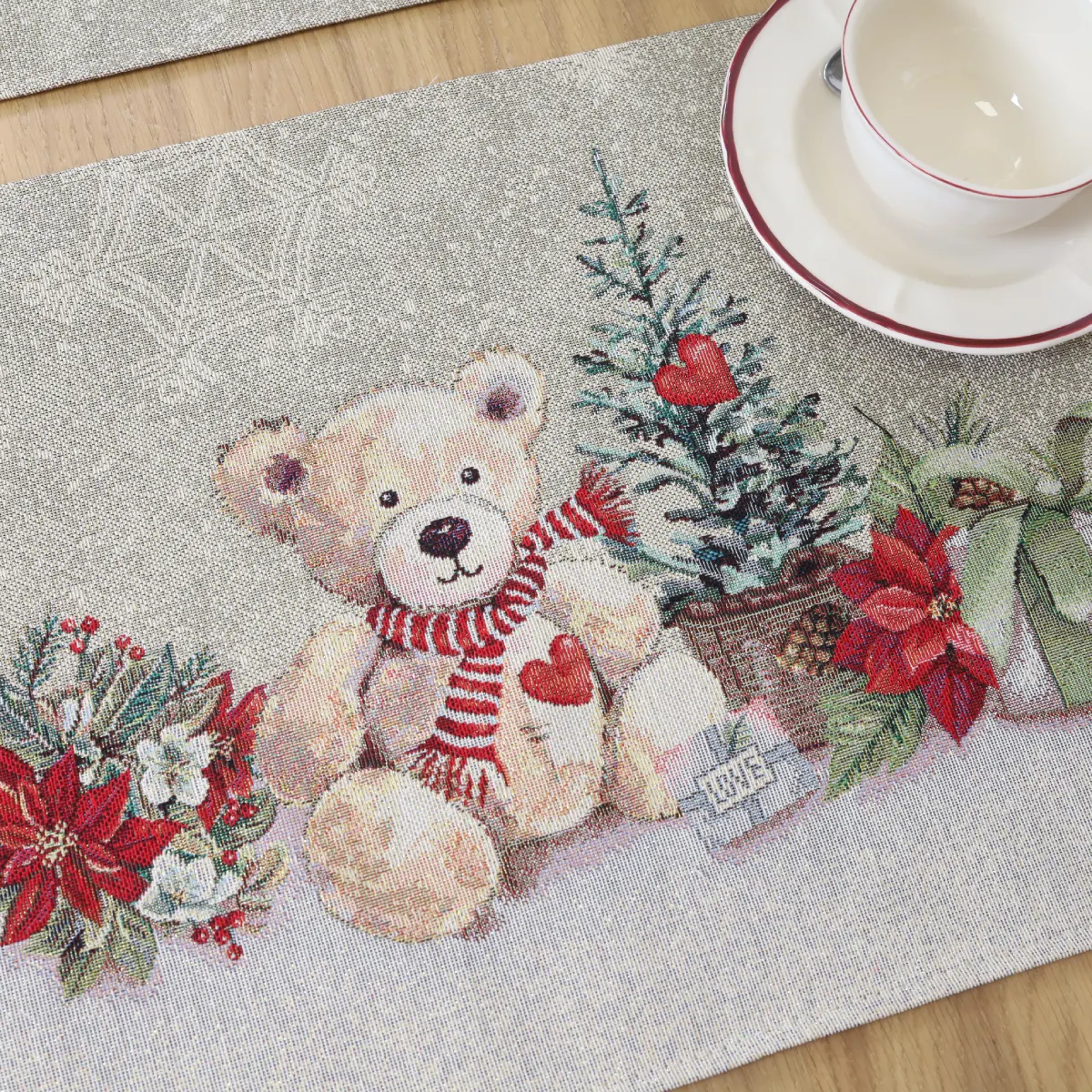 Puošni, elegantiška, tvirto gobeleninio audinio stalo servetėlė Dovanų meškutis, papuošta kalėdiniais motyvais. Tai puiki ir įsimintina Kalėdų dovana.
