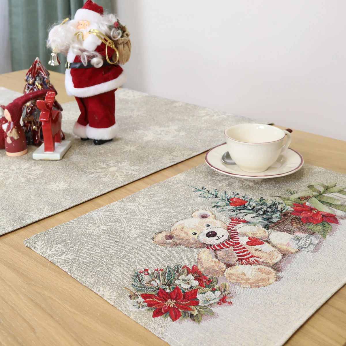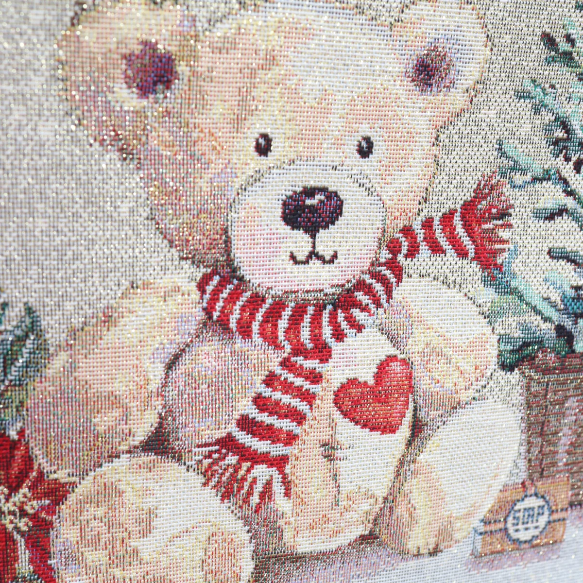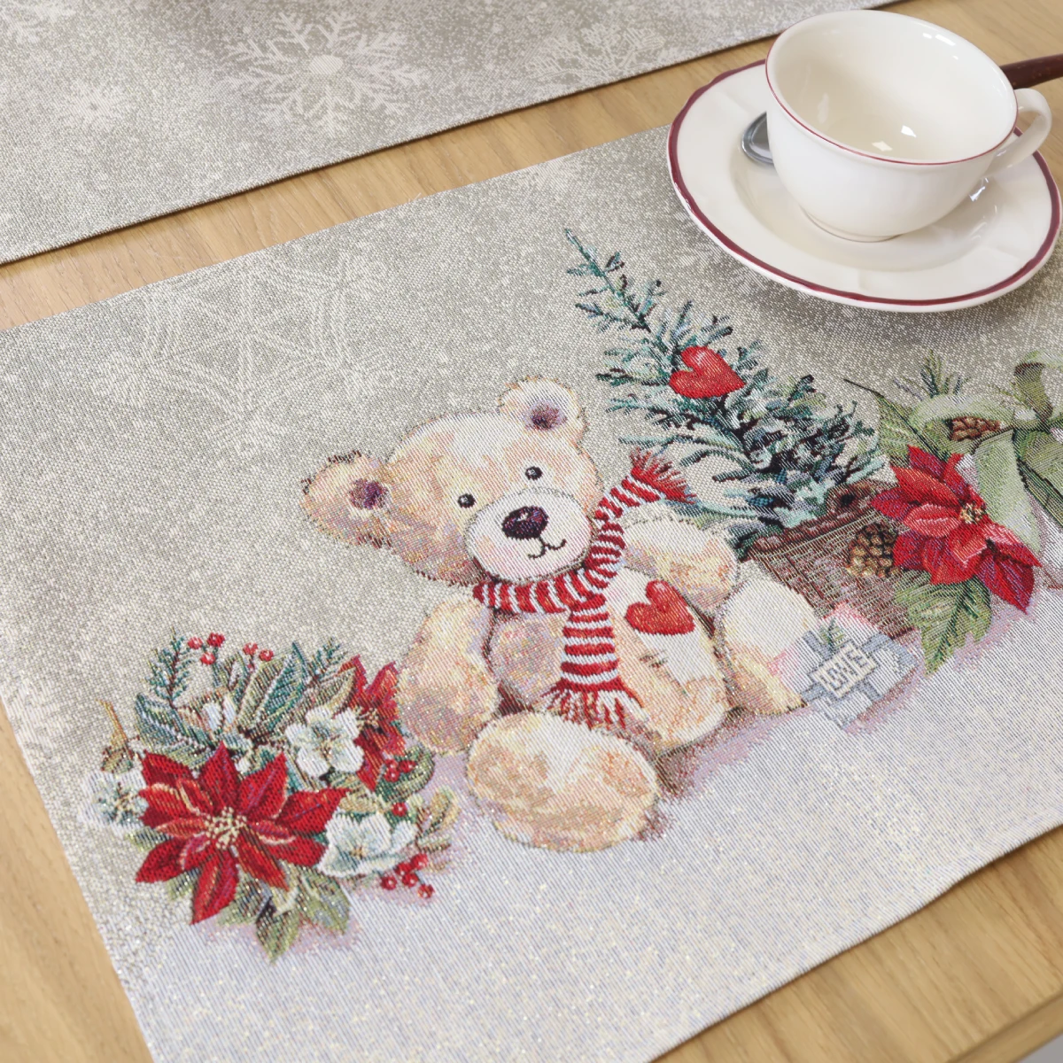 Puošni, elegantiška, tvirto gobeleninio audinio stalo servetėlė Dovanų meškutis, papuošta kalėdiniais motyvais. Tai puiki ir įsimintina Kalėdų dovana.