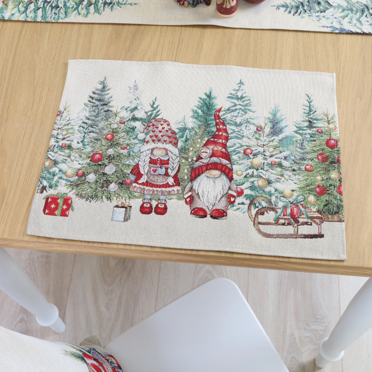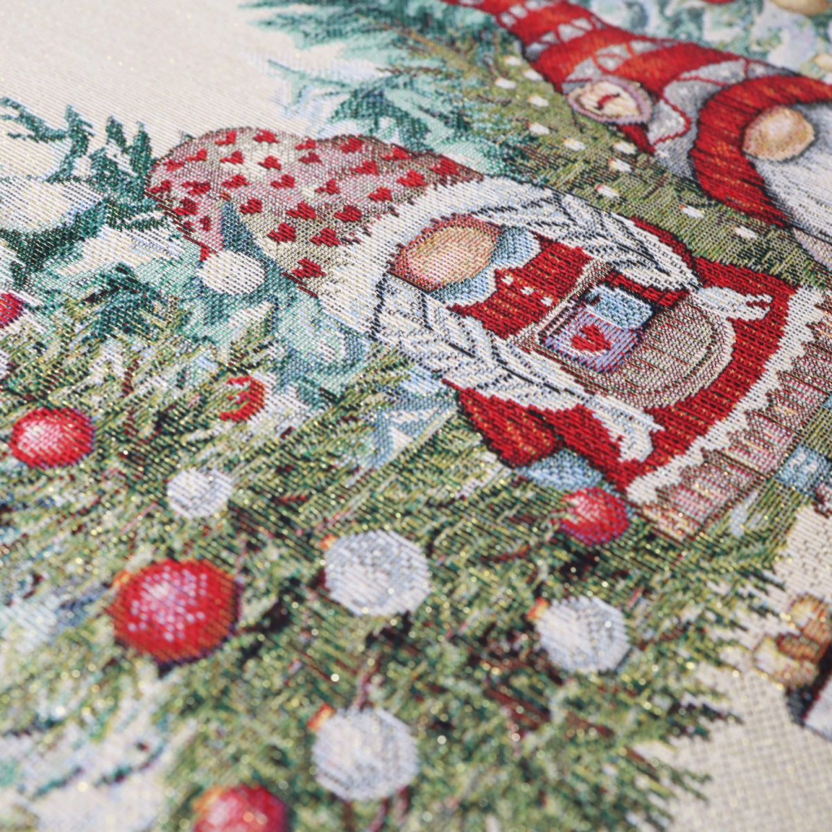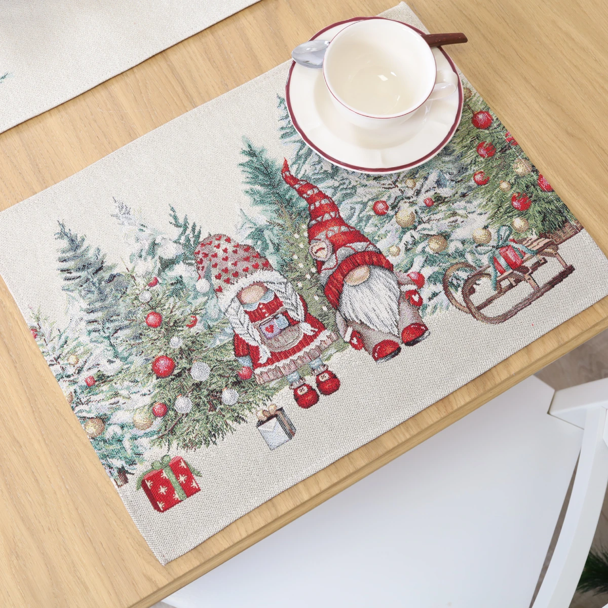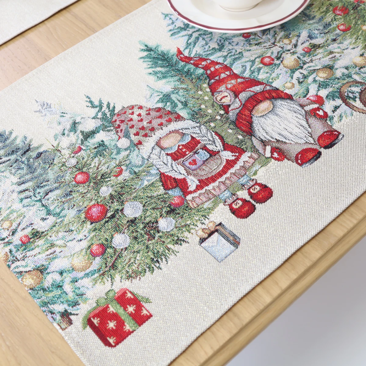 Puošni, elegantiška, tvirto gobeleninio audinio stalo servetėlė Dovanų metas, papuošta kalėdiniais motyvais. Tai puiki ir įsimintina Kalėdų dovana.