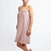 Vaflinė rožinės spalvos medvilnės ir lino audinio moteriška pirties/vonios prijuostė Jai, mėgstančiai pirtį, natūralumą ir patogumą. Susegama sagutėmis ties krūtine platesnės gumos pagalba reguliuojant plotį, ilgio iki kelių pirties prijuostė pasiūta siekiant maksimaliai suderinti naudingas audinio savybes ir patogumą nešioti. Ši pirties/vonios prijuostė: