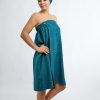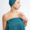 Turkio spalvos vaflinė pirties prijuostė iš medvilnės ir lino audinio – jai, mėgstančiai pirtį, natūralumą ir patogumą. Susegama sagutėmis ties krūtine platesnės gumos pagalba reguliuojant plotį, ilgio iki kelių pirties prijuostė pasiūta siekiant maksimaliai suderinti naudingas audinio savybes ir patogumą nešioti. Ši pirties prijuostė: