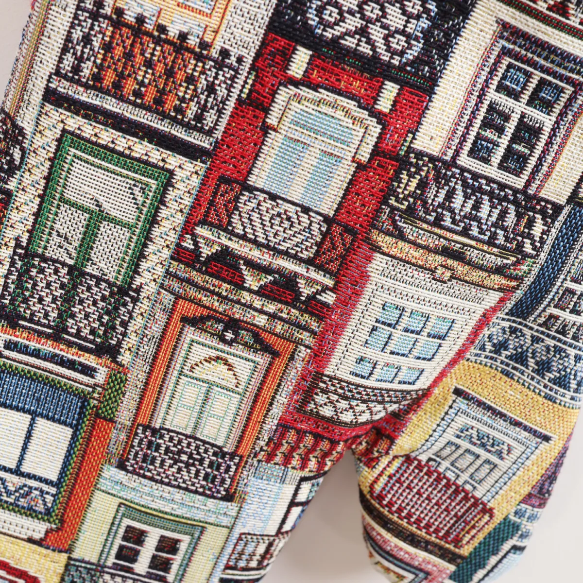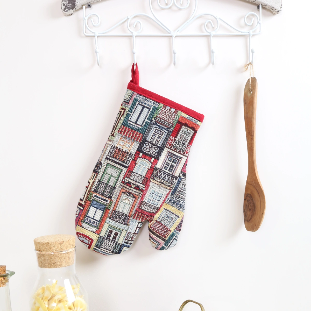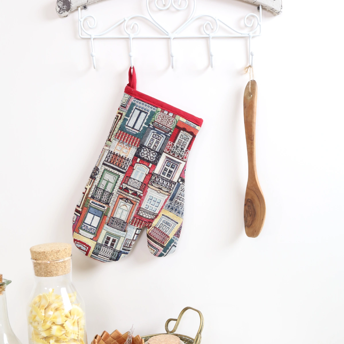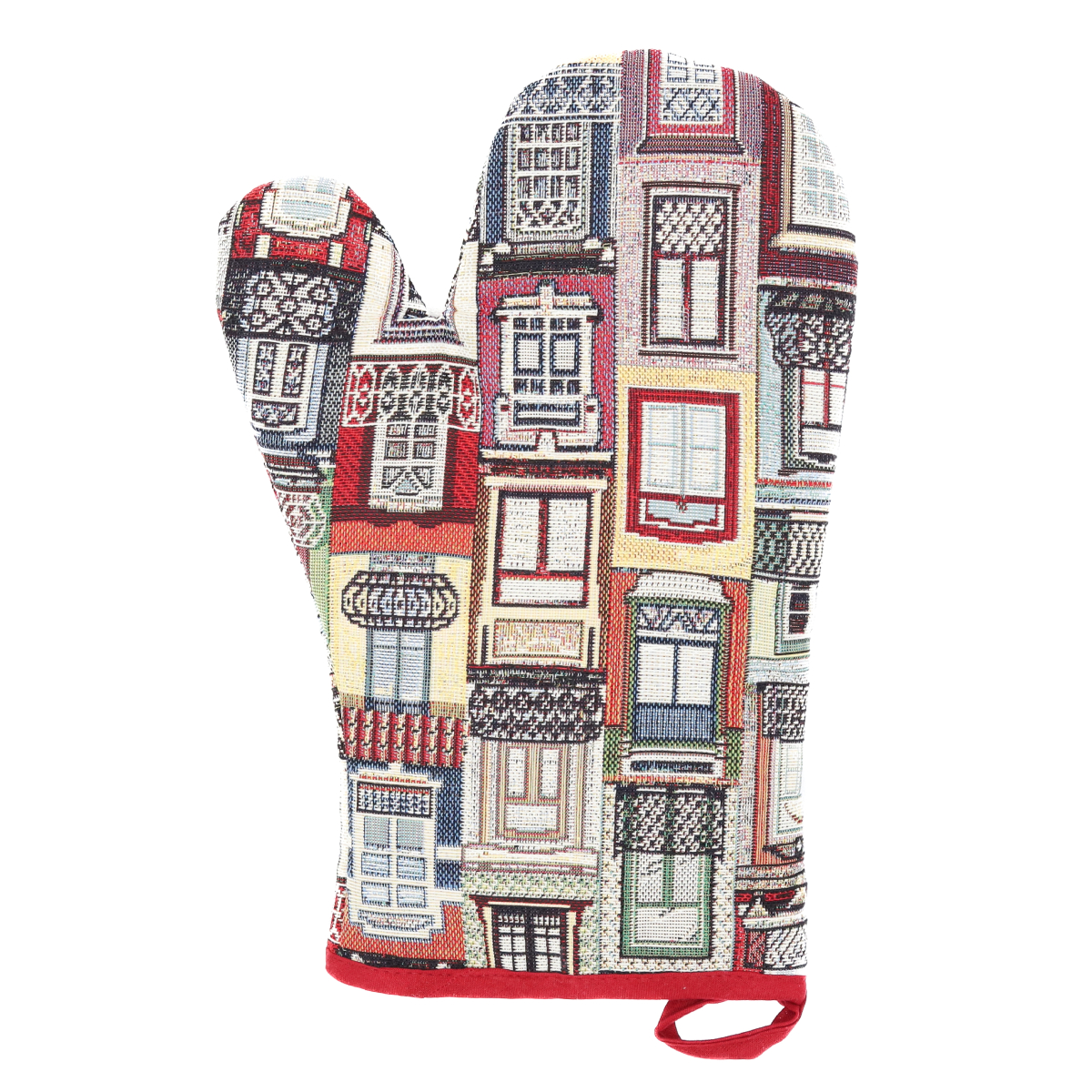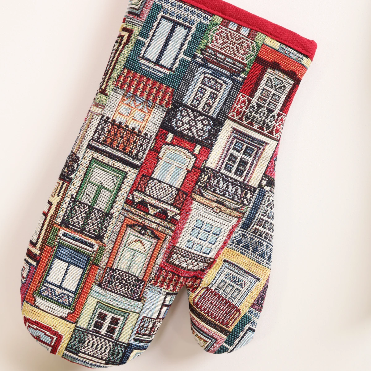Virtuvinė pirštinė iš austos gobeleno medžiagos.