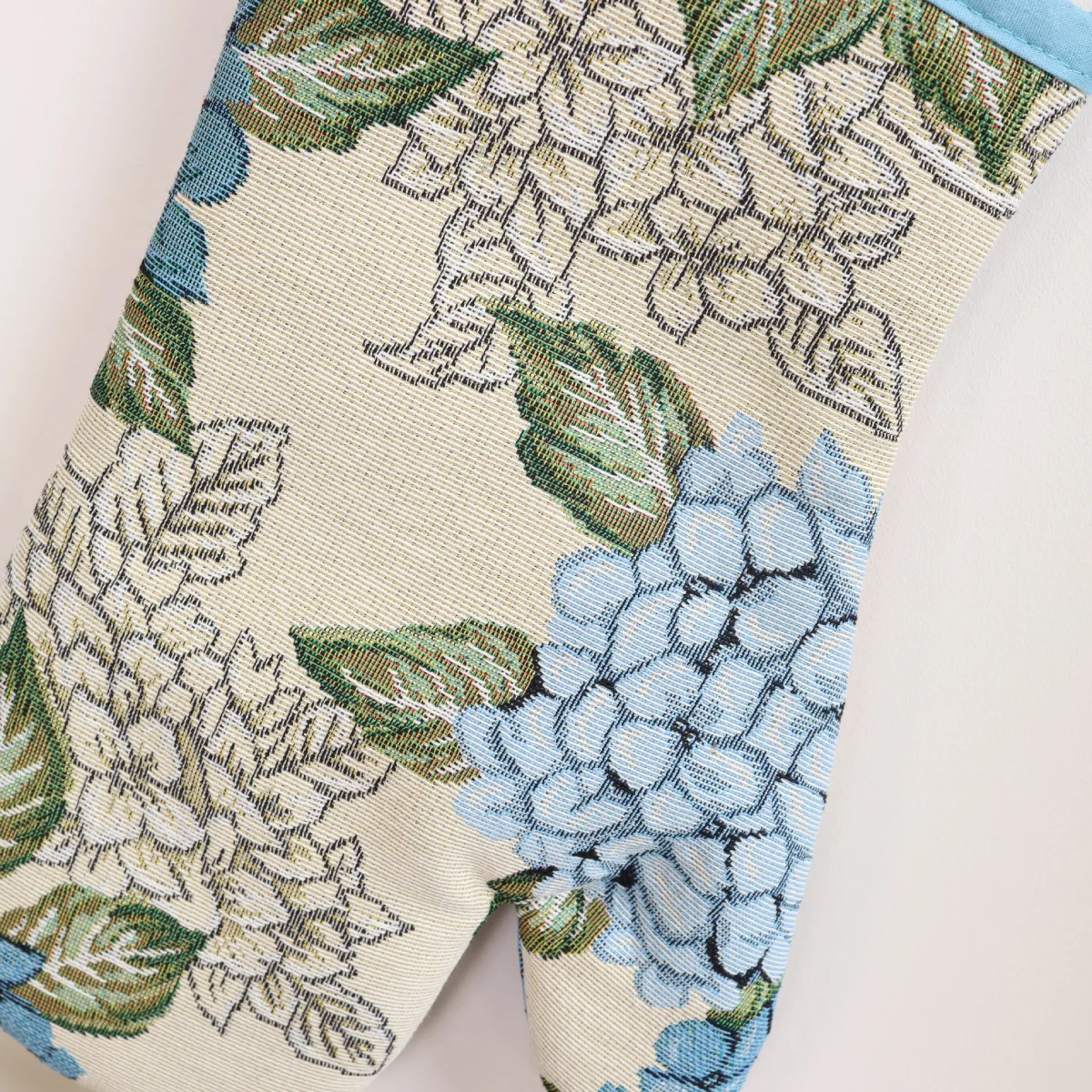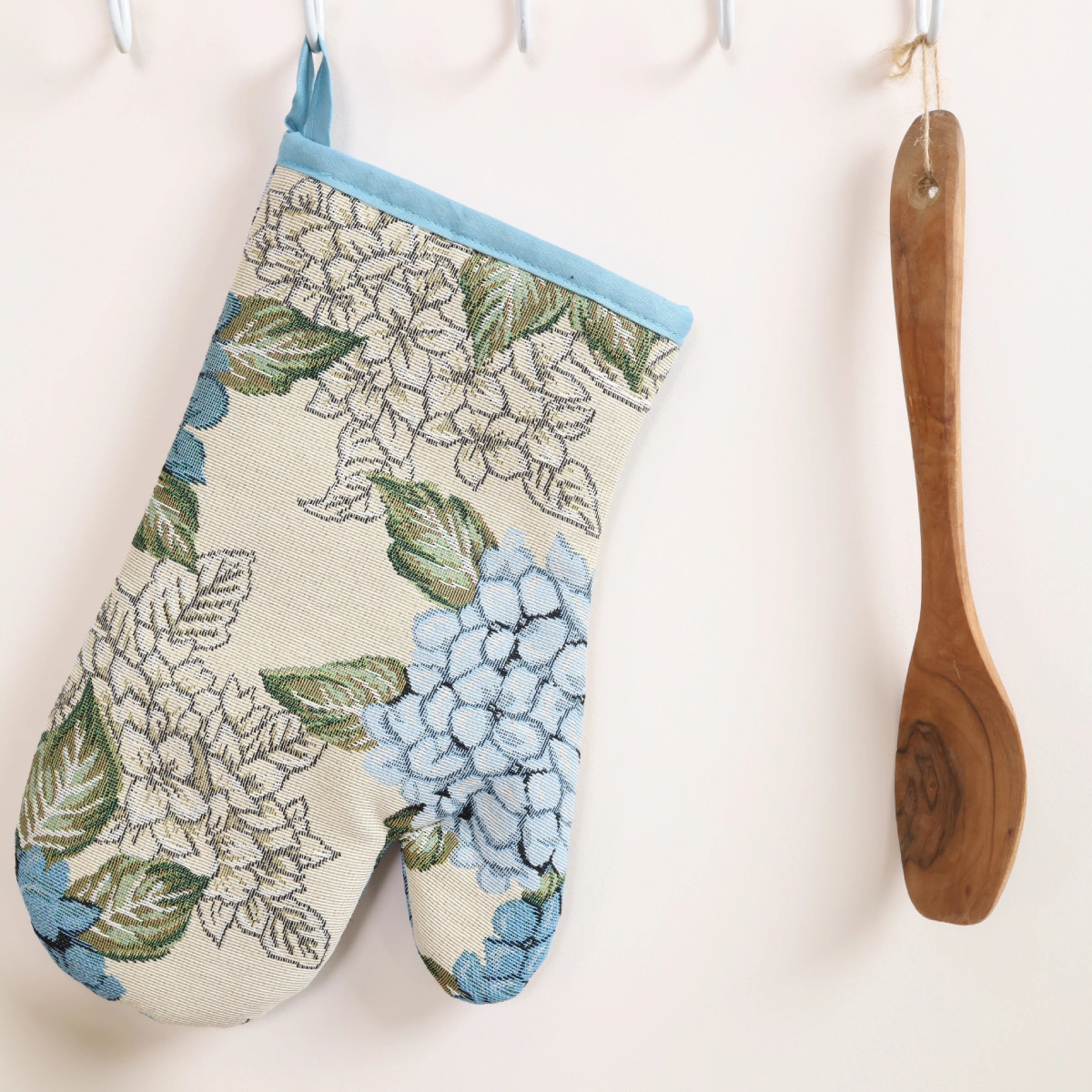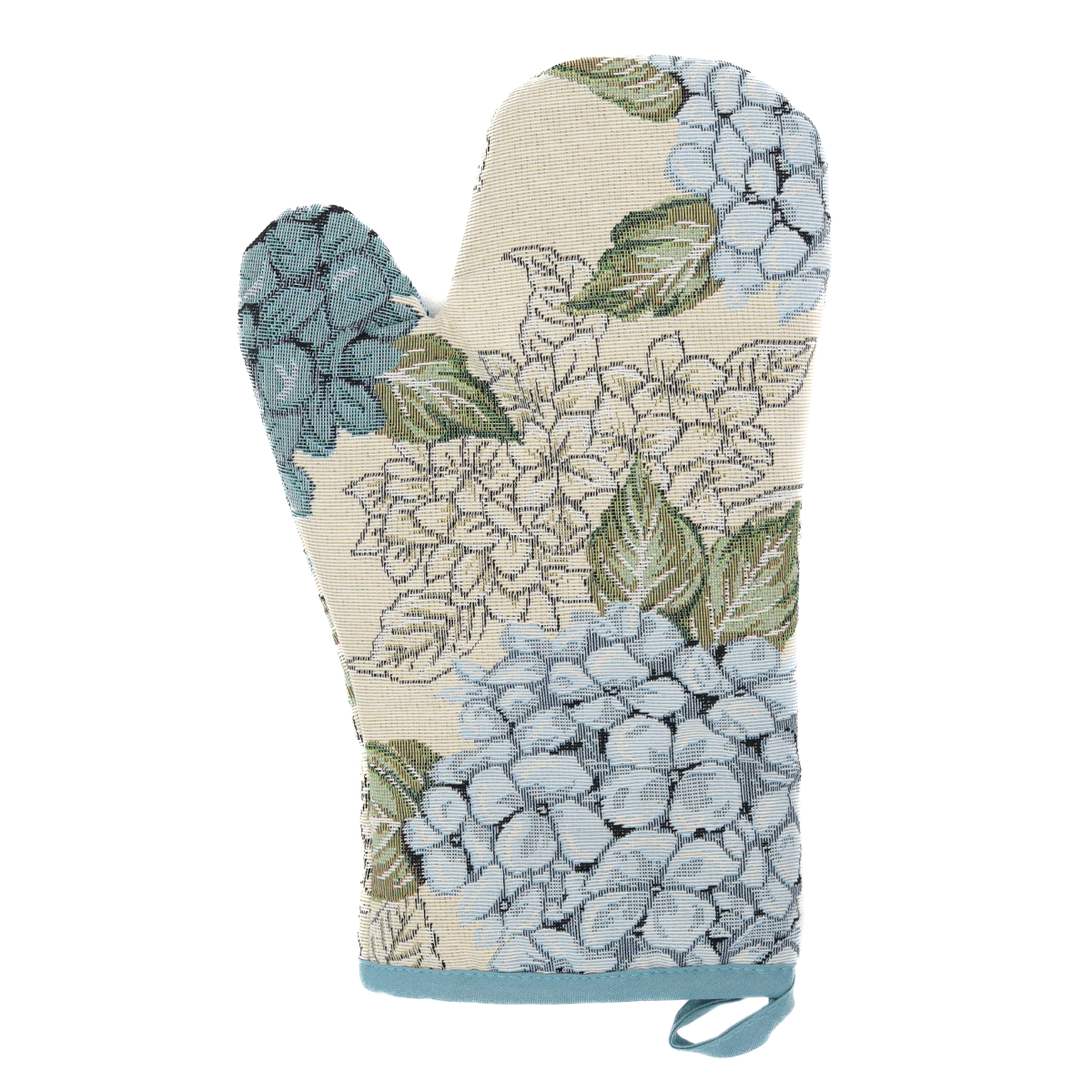 Virtuvinė pirštinė iš austos gobeleno medžiagos.