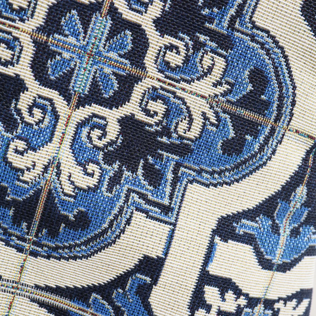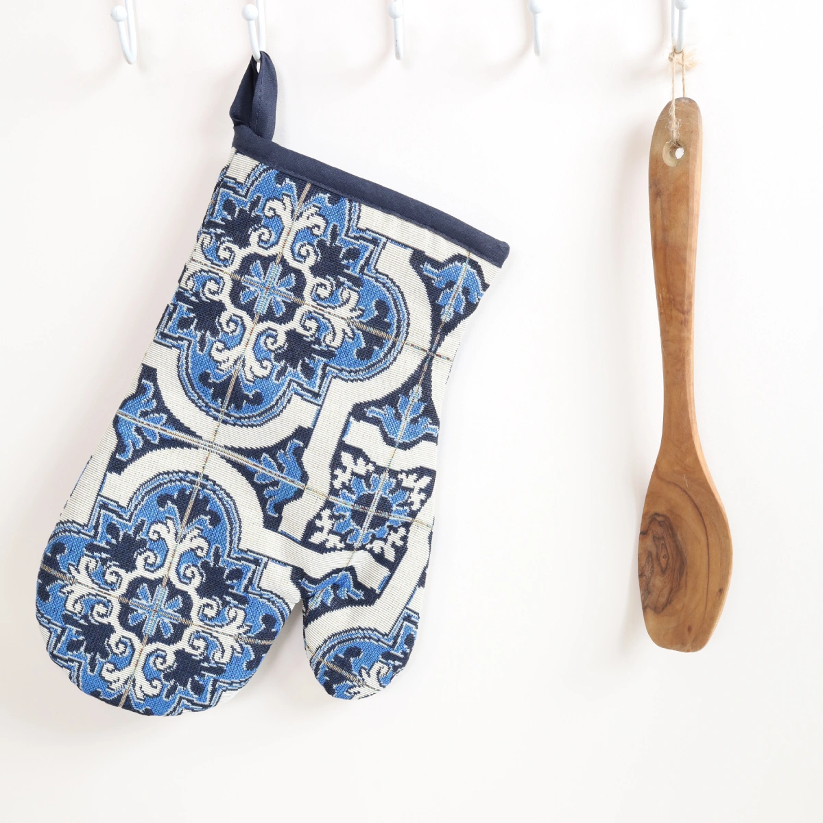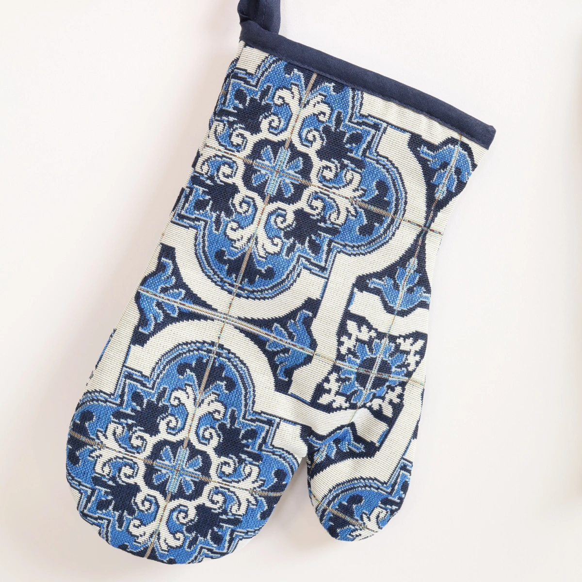 Virtuvinė pirštinė iš austos gobeleno medžiagos.