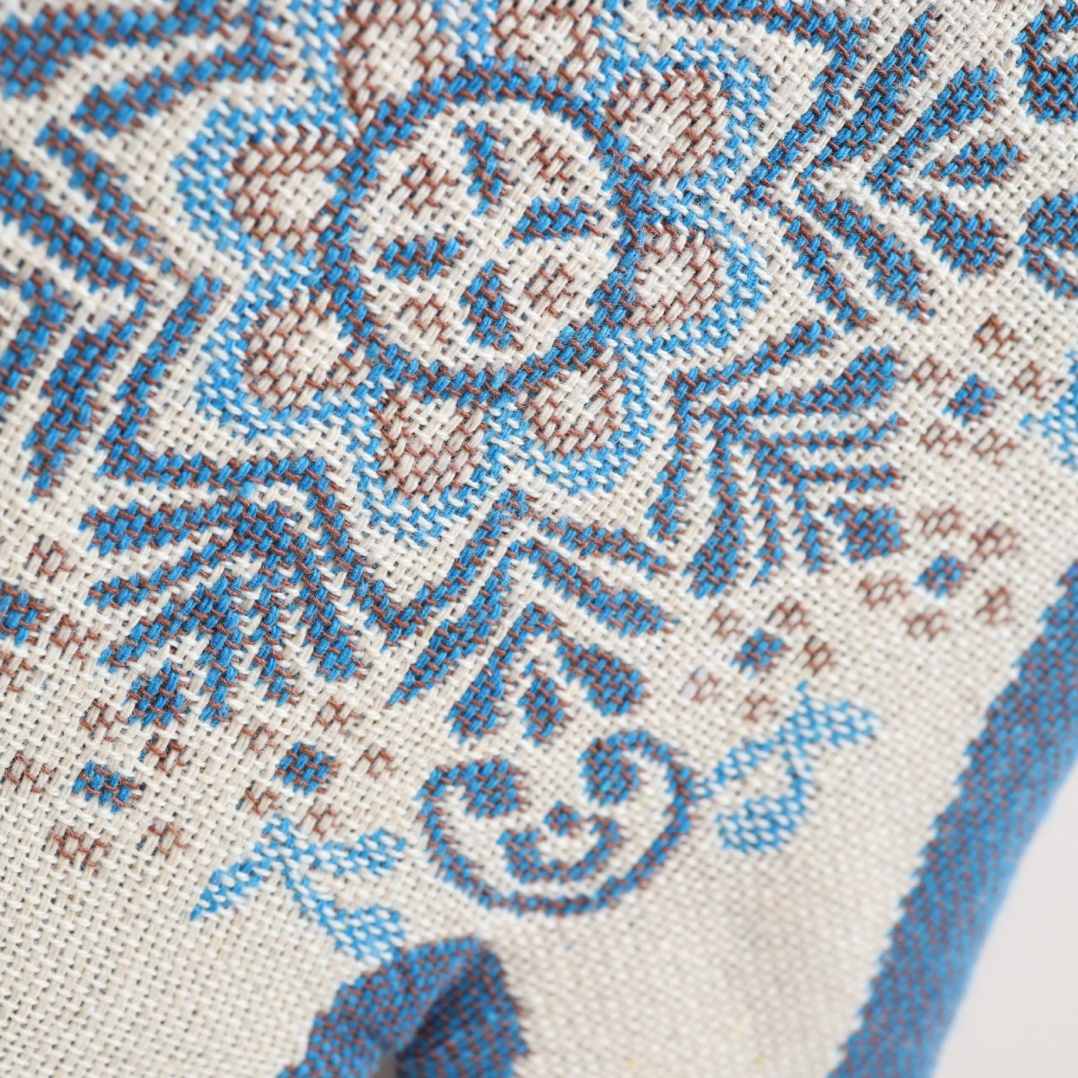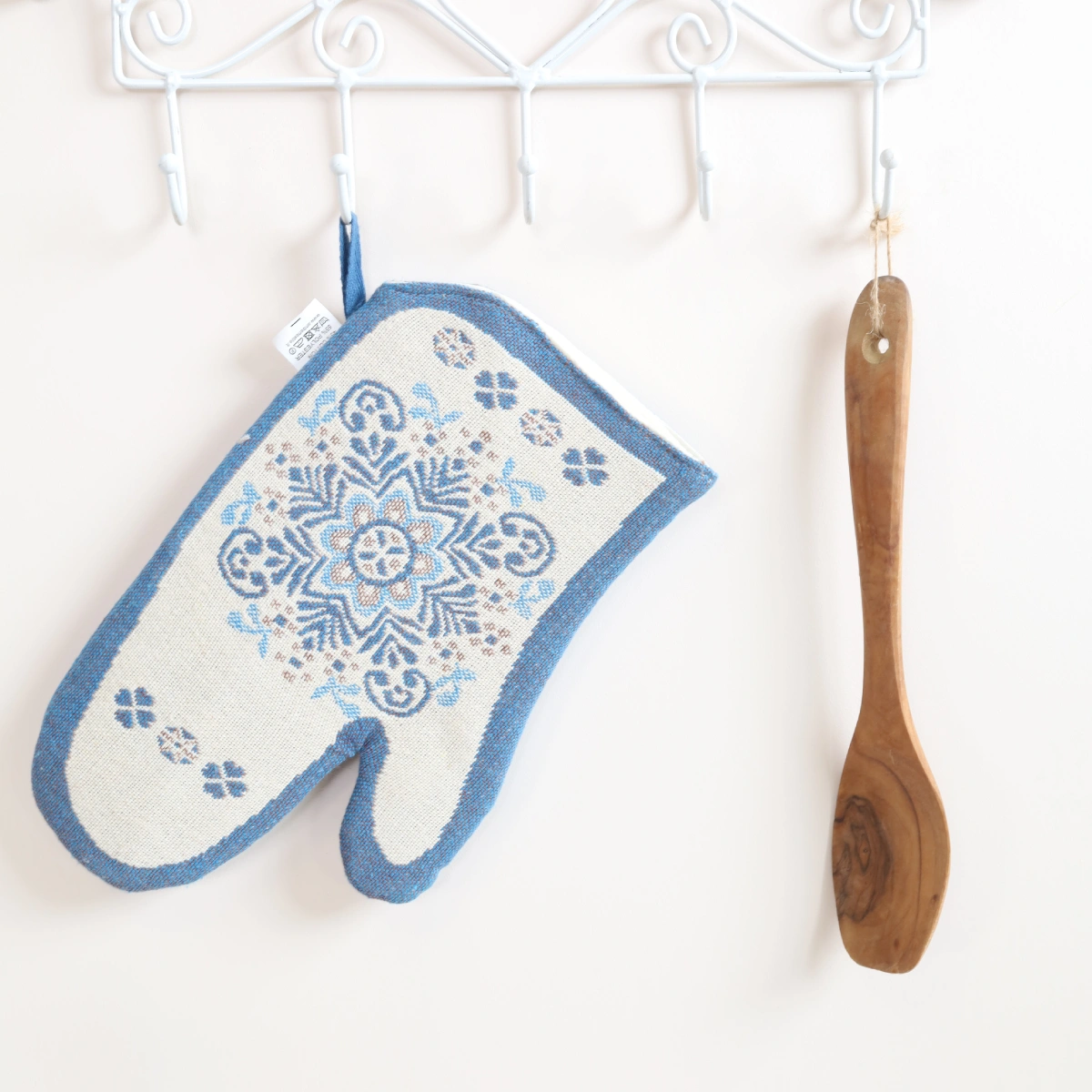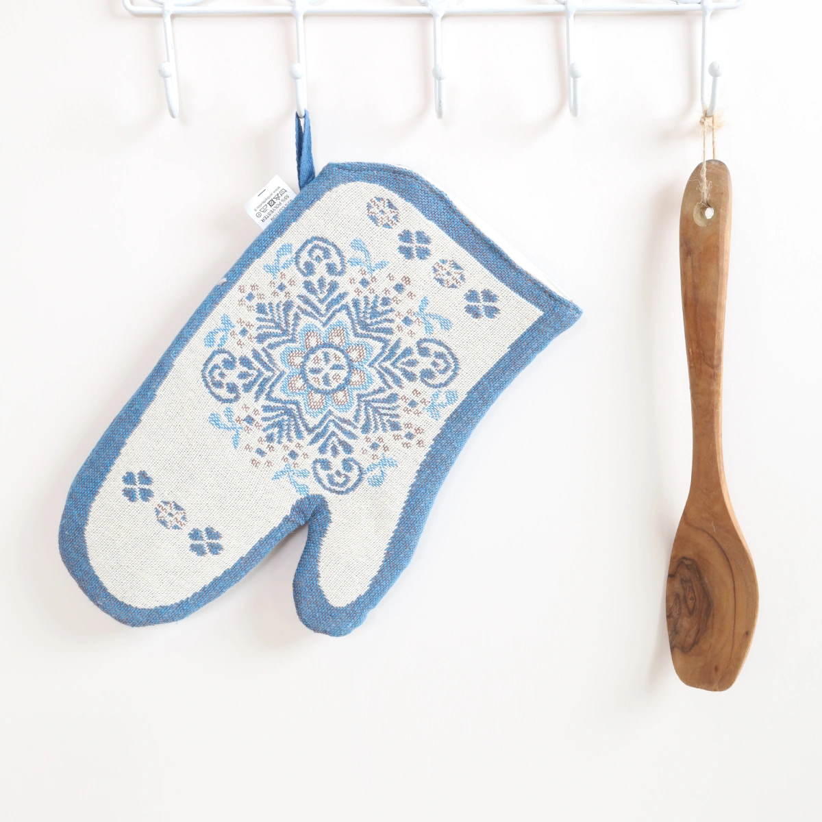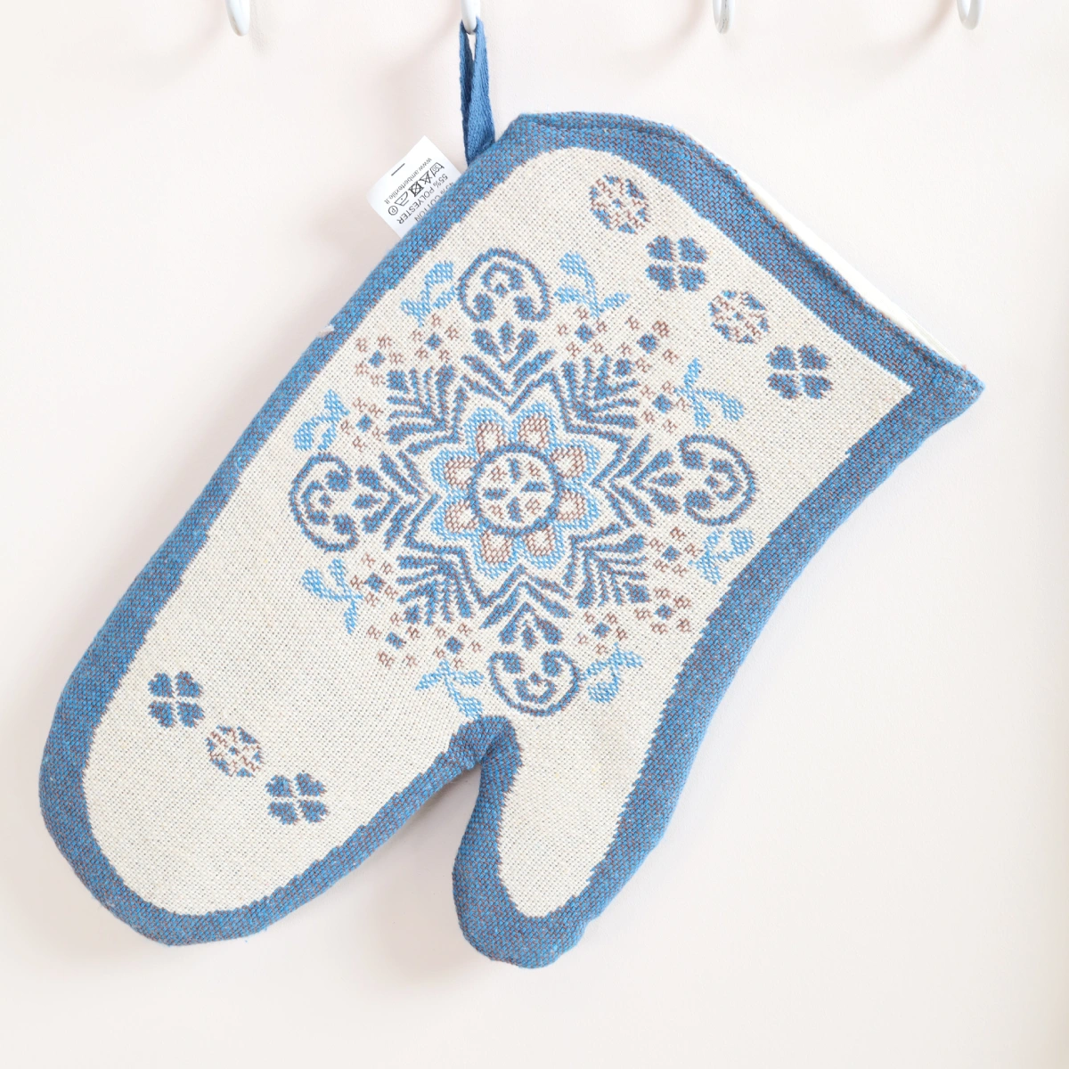 Virtuvinė pirštinė iš austos gobeleno medžiagos.