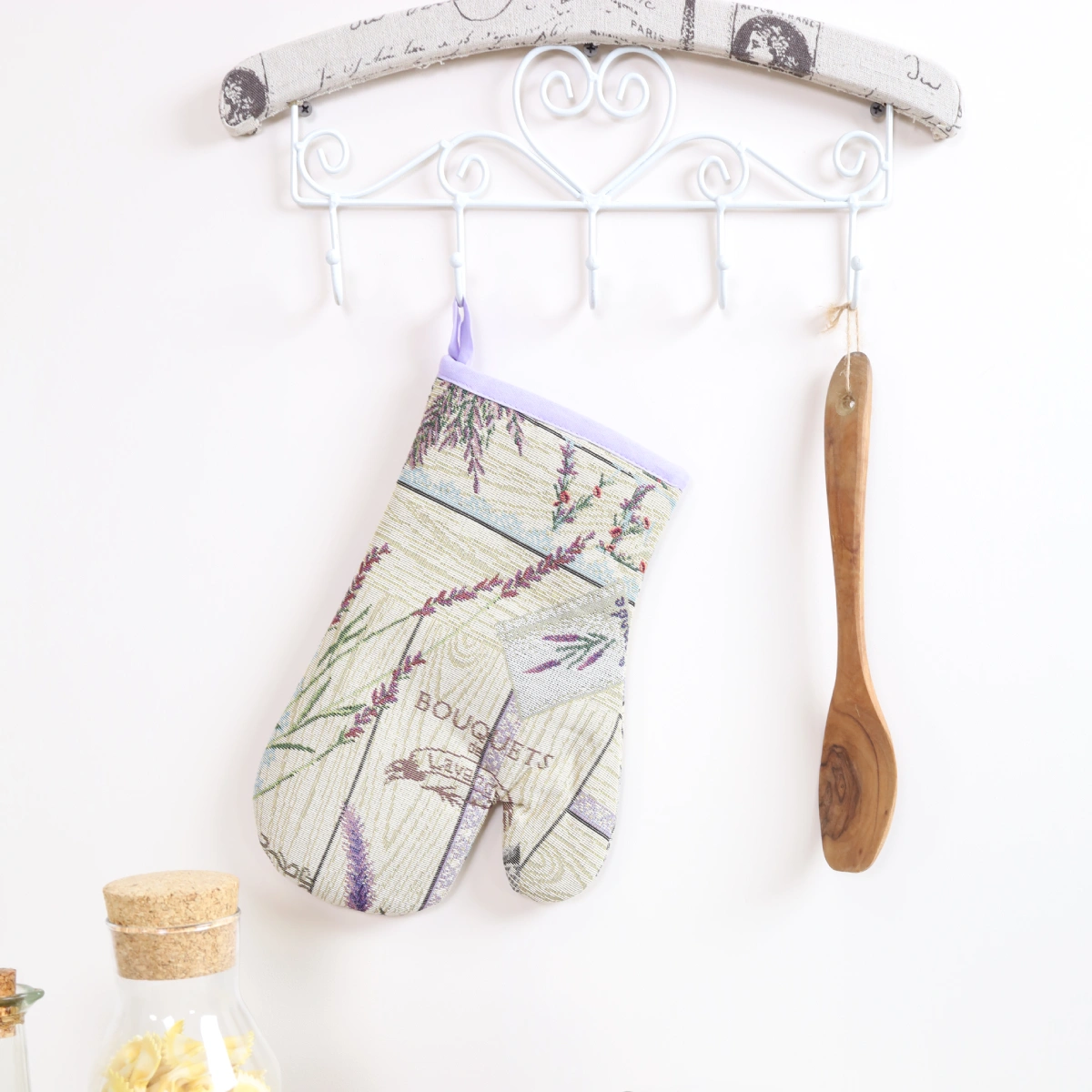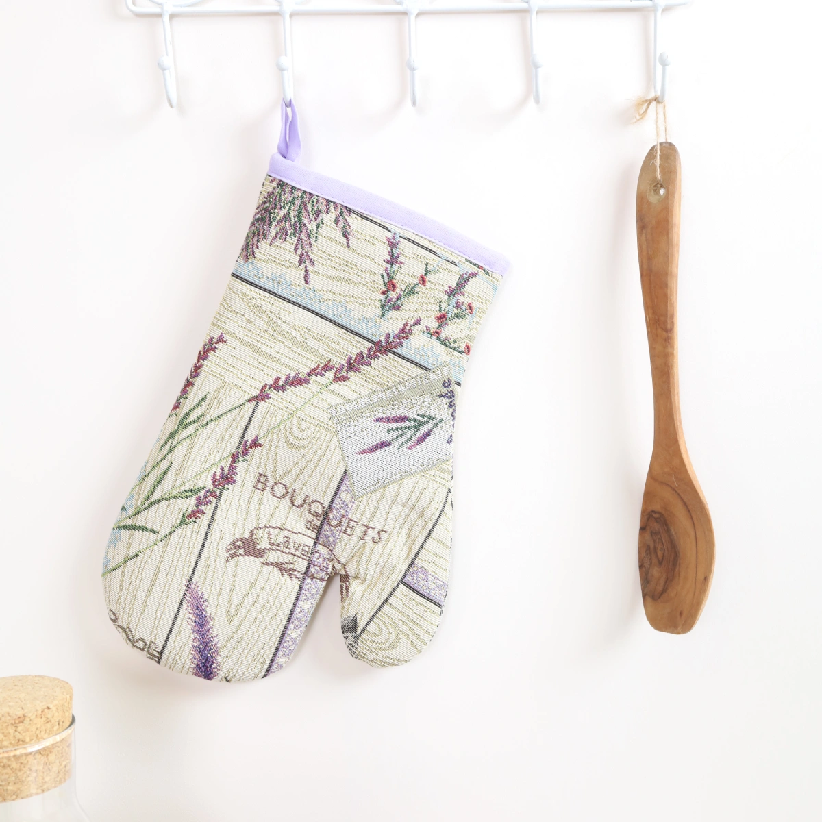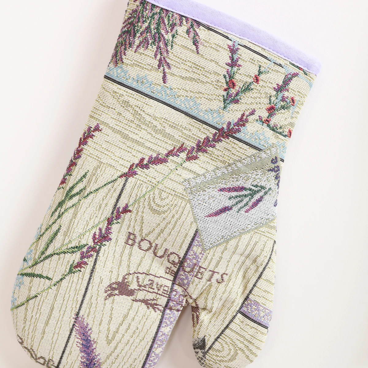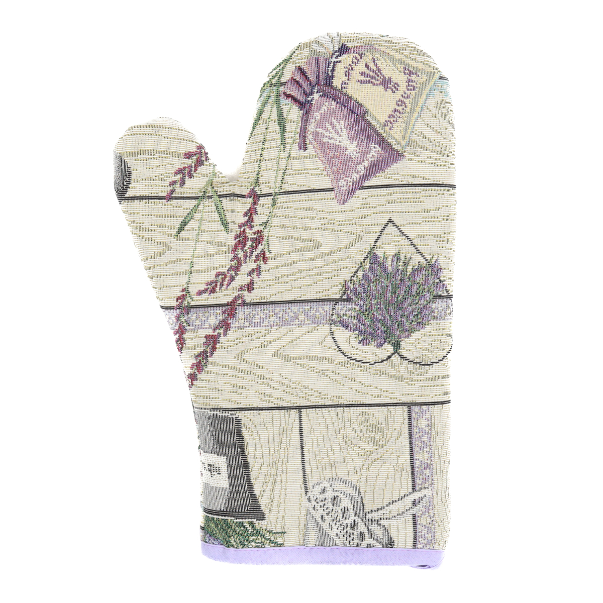 Virtuvinė pirštinė iš austos gobeleno medžiagos.