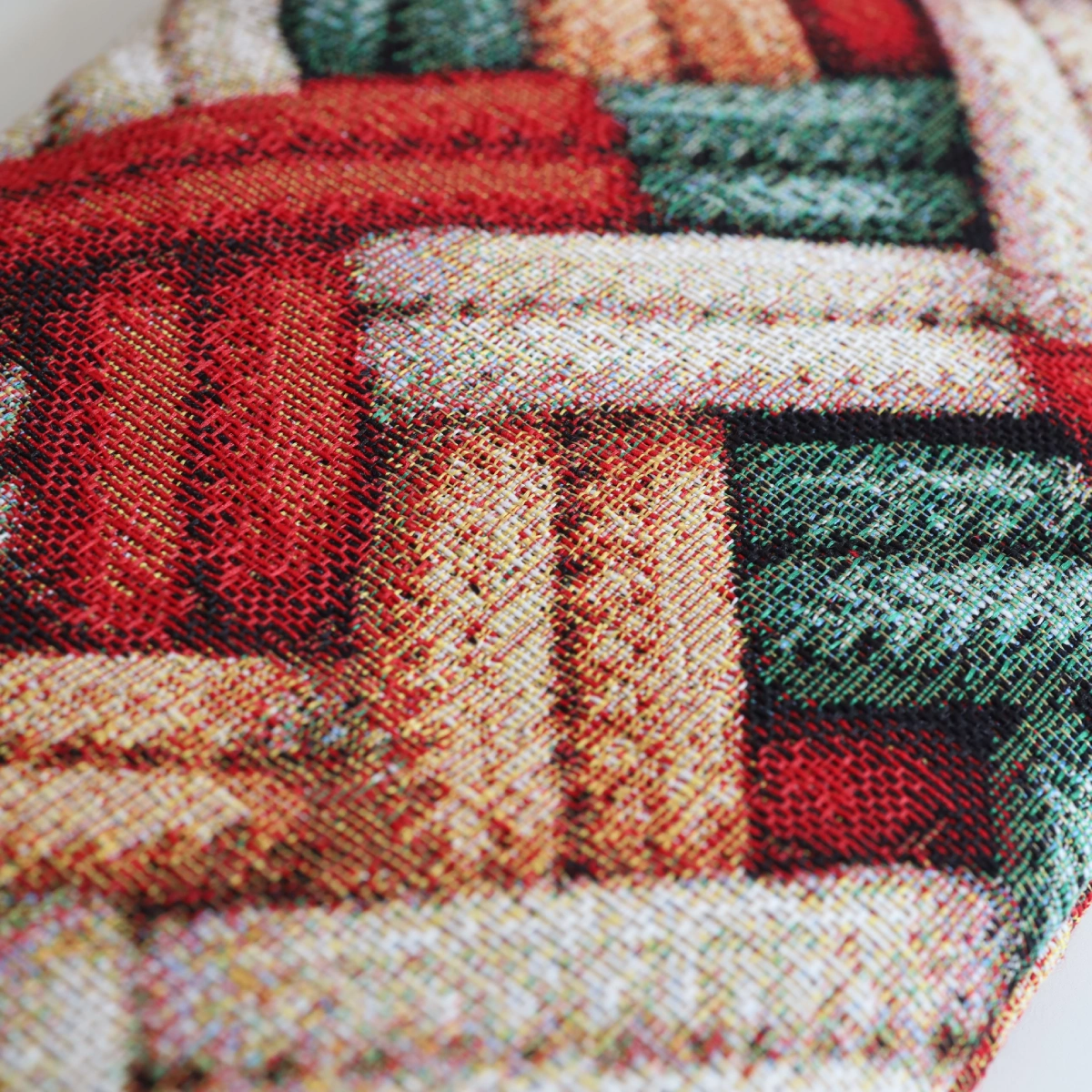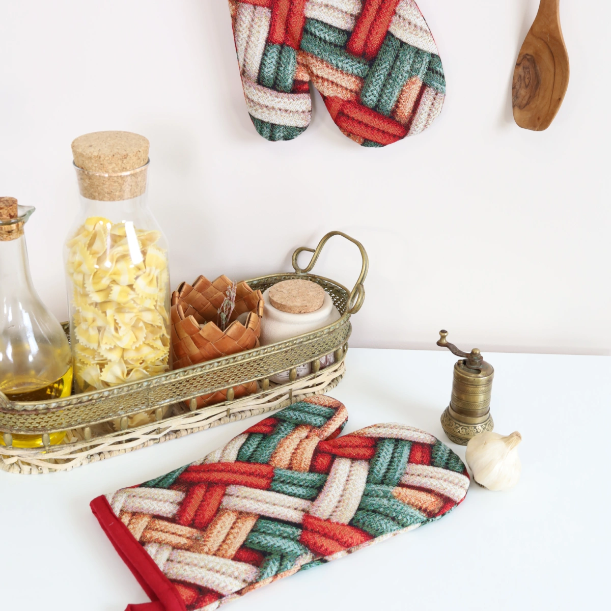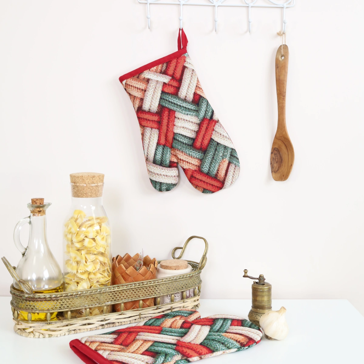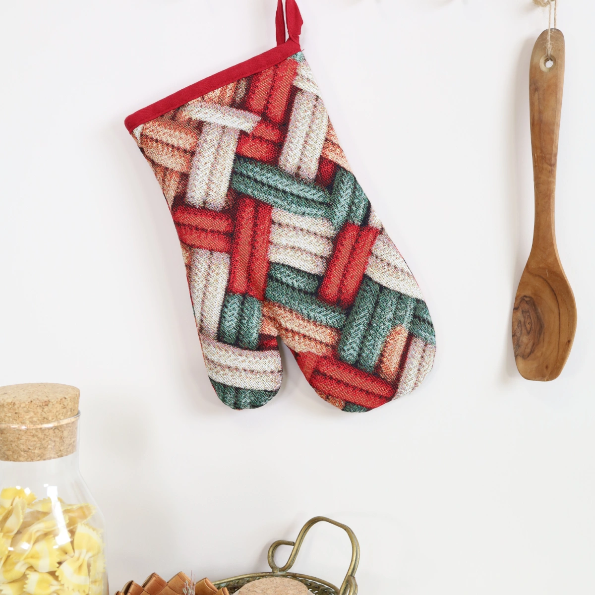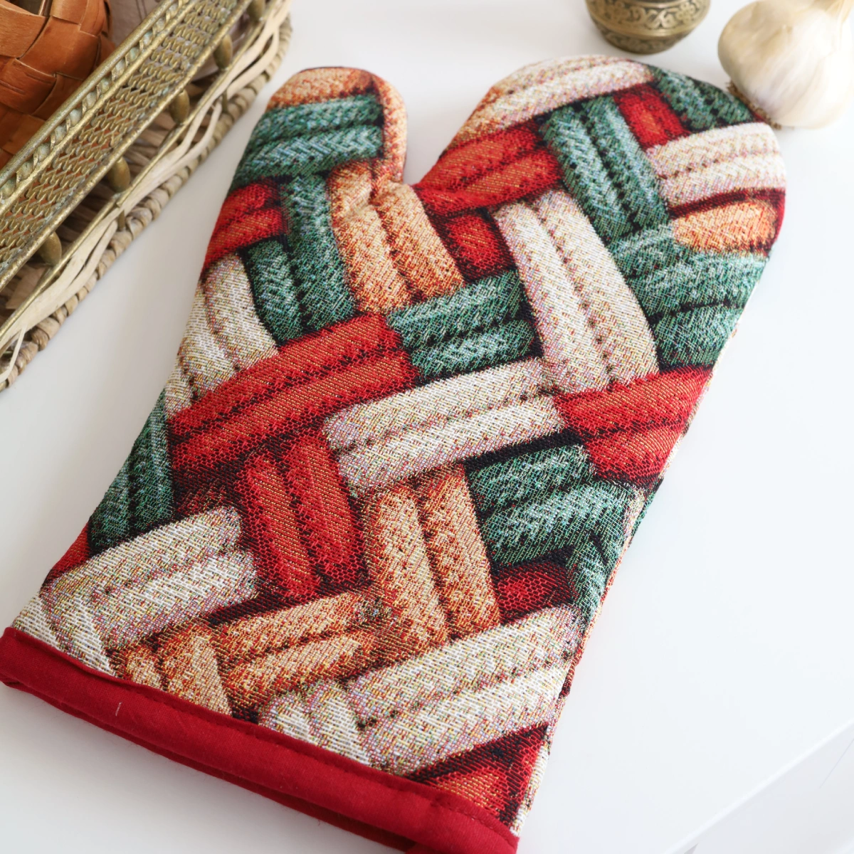 Virtuvinė pirštinė iš austos gobeleno medžiagos.