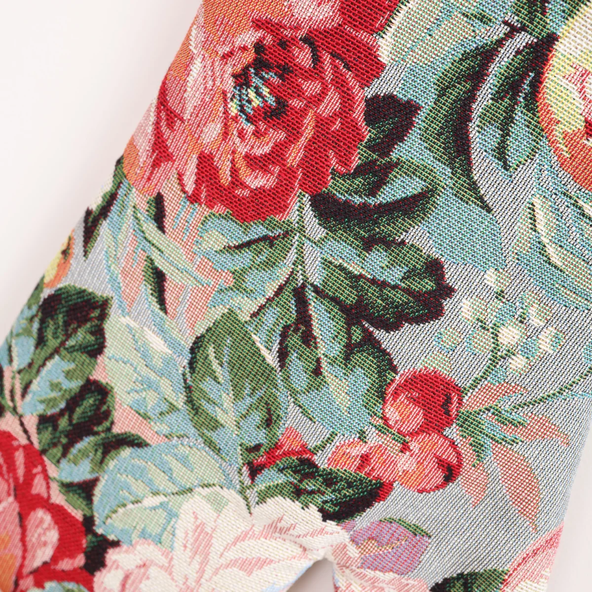Virtuvinė pirštinė iš austos gobeleno medžiagos.