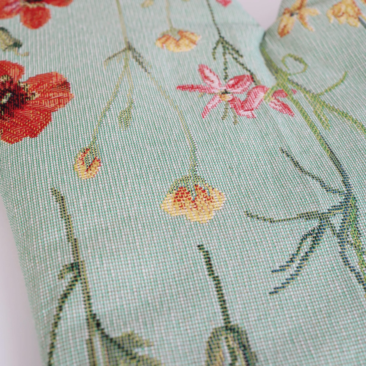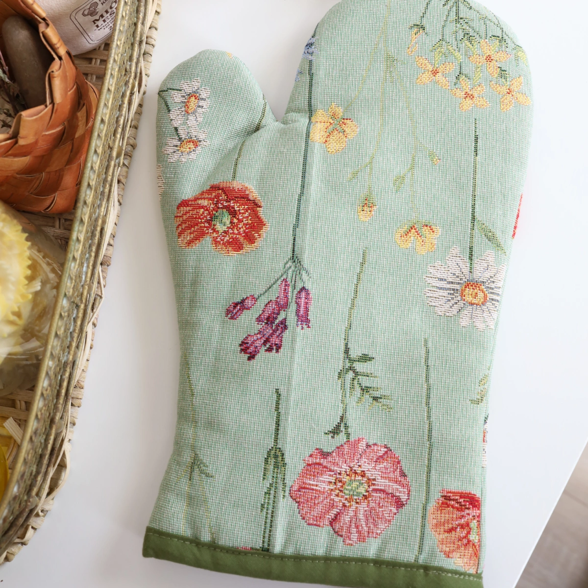 Virtuvinė pirštinė iš austos gobeleno medžiagos.
