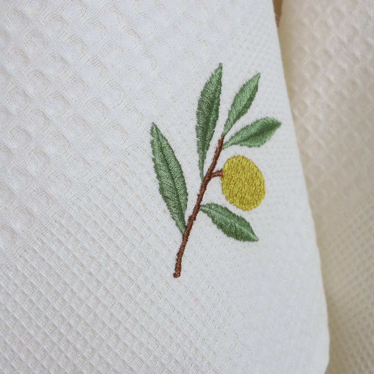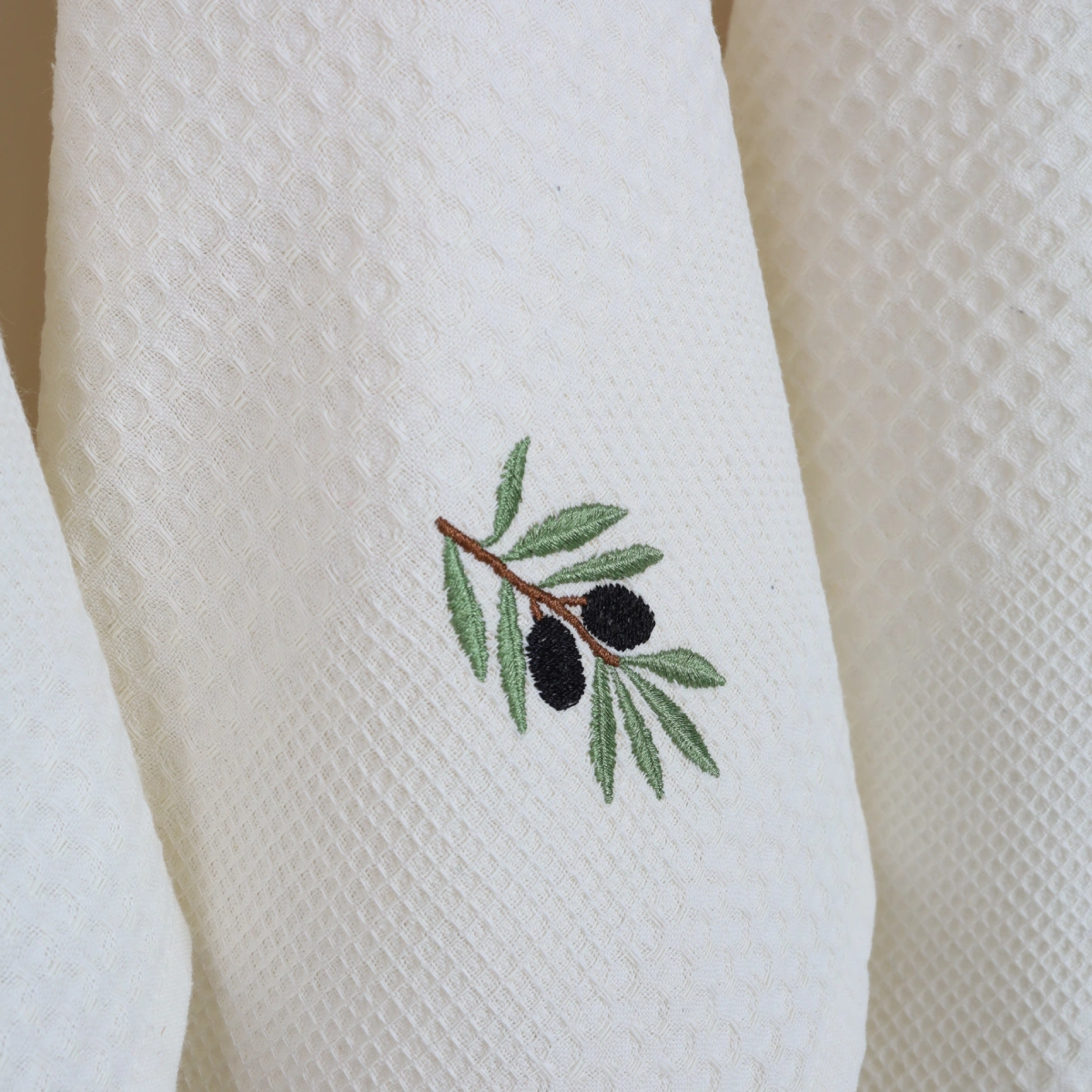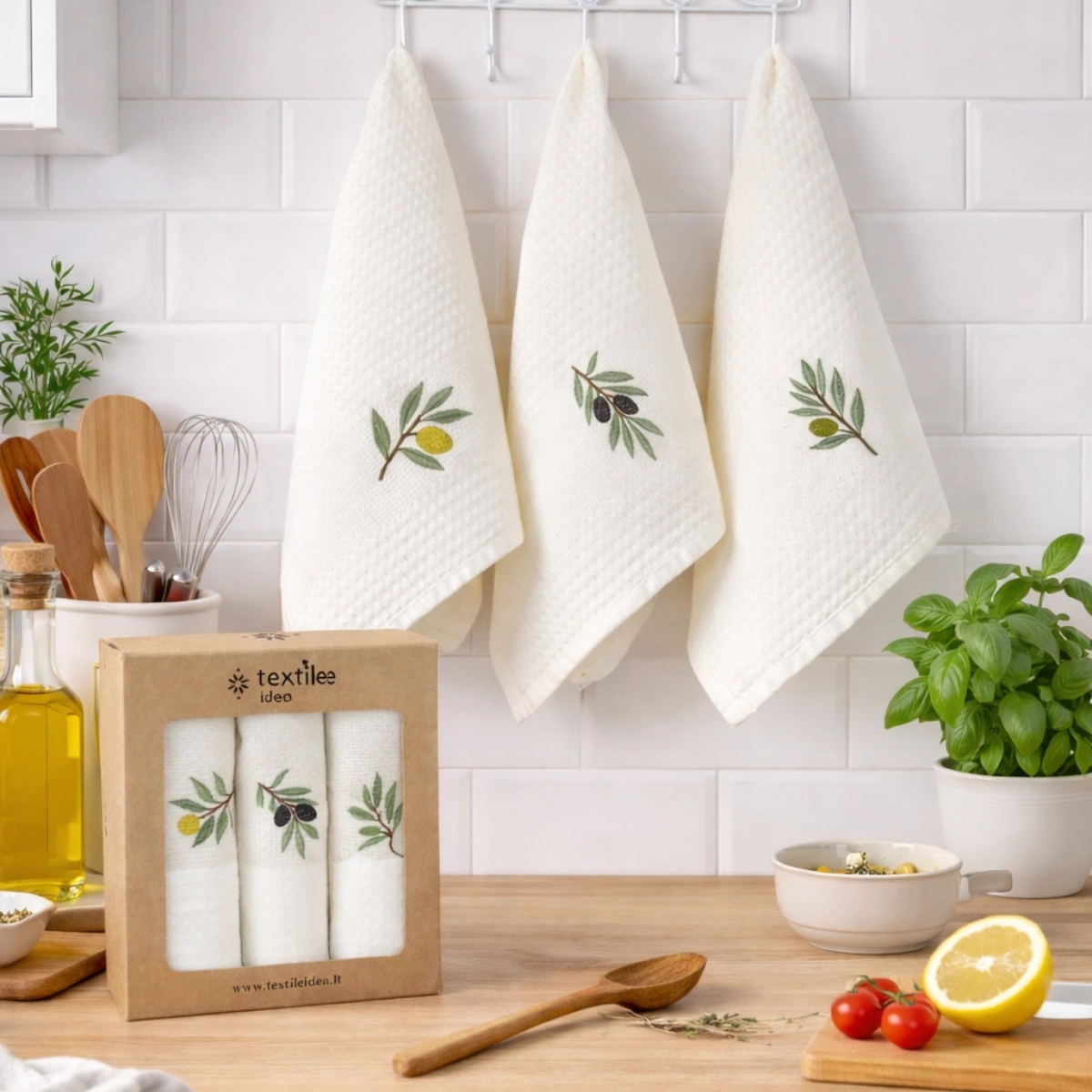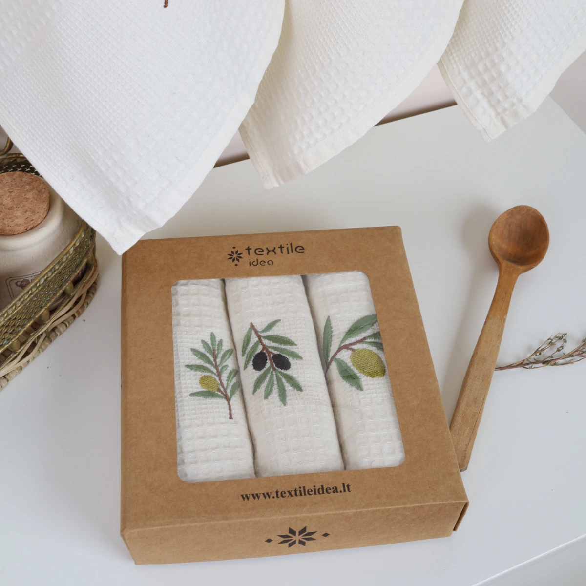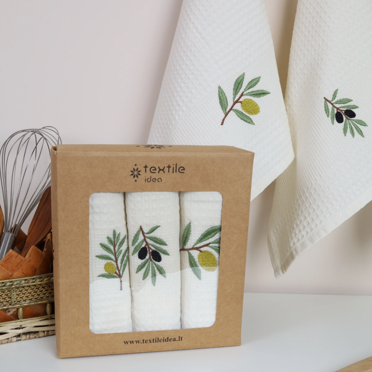 Virtuvinių rankšluosčių rinkinys Alyvuogės sudaro 3 vnt. skirtingų to paties stiliaus rankšluosčių.