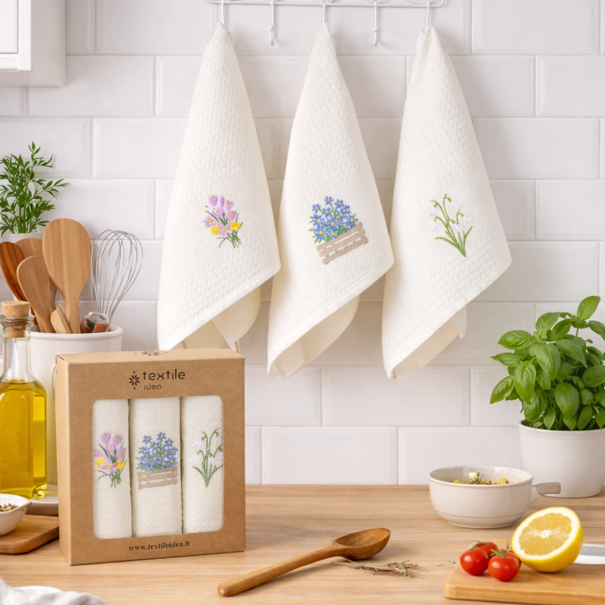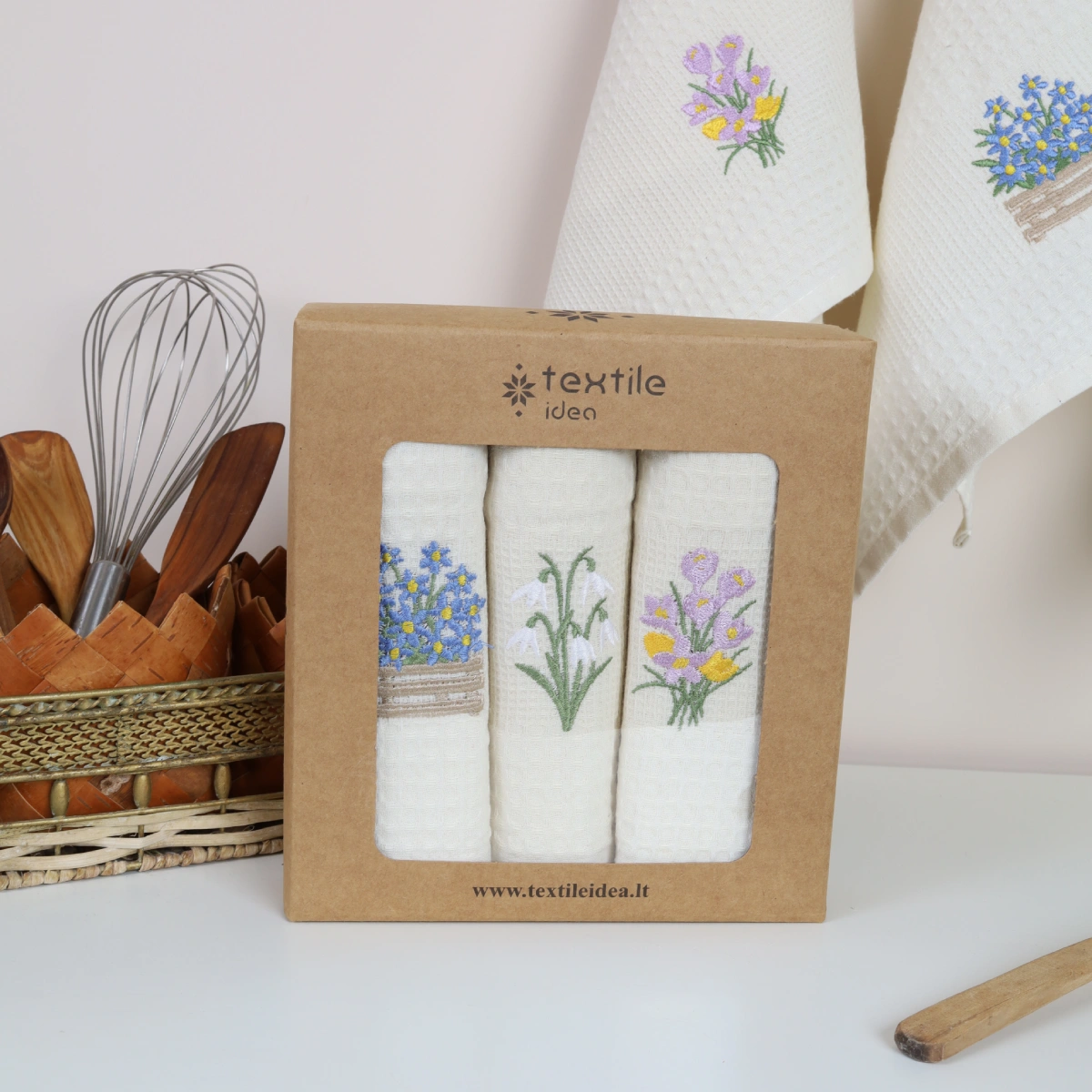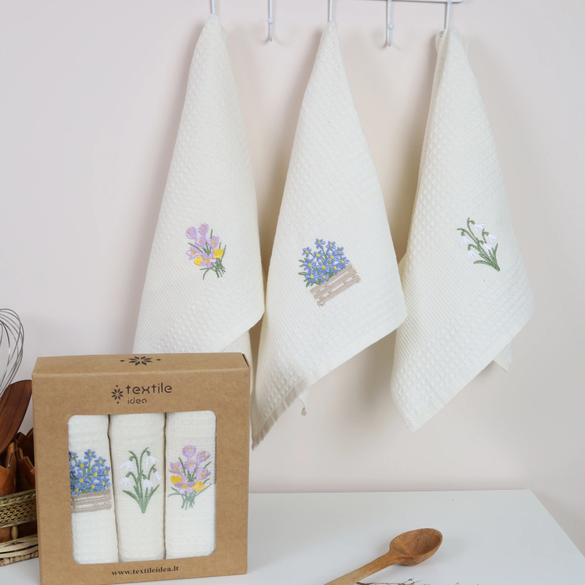 Virtuvinių rankšluosčių rinkinys Krokai sudaro 3 vnt. skirtingų to paties stiliaus rankšluosčių.