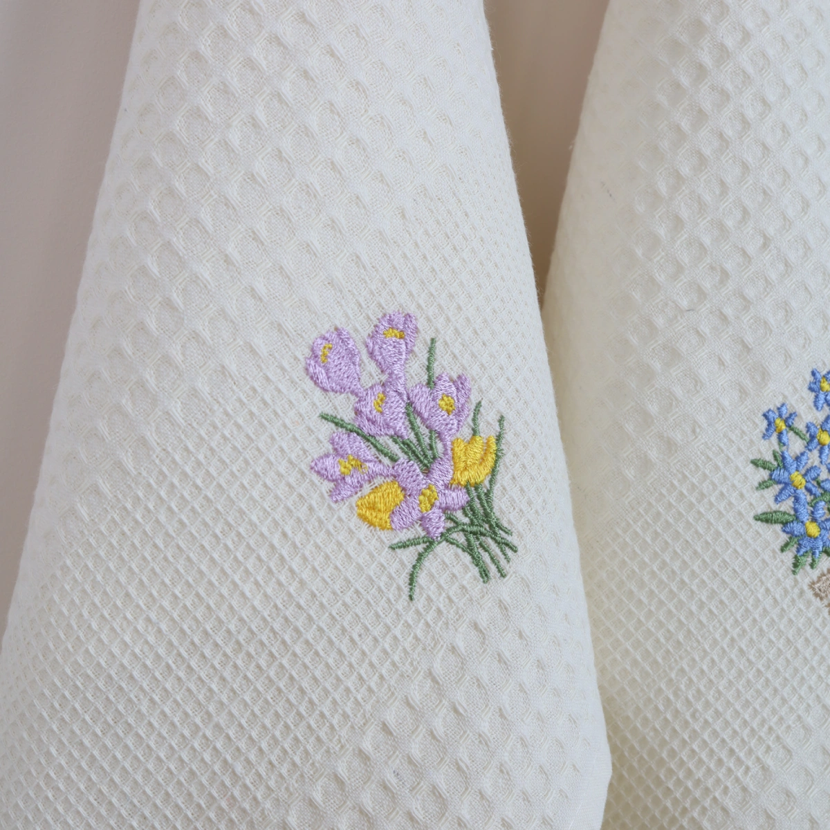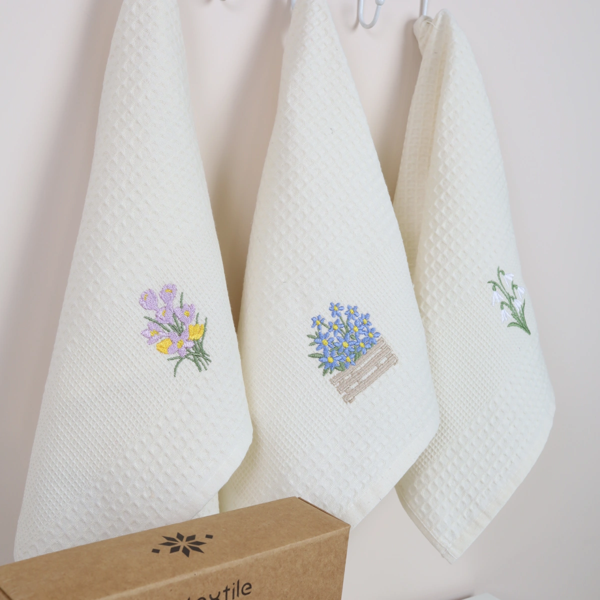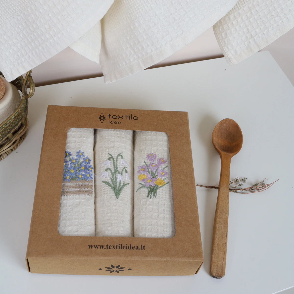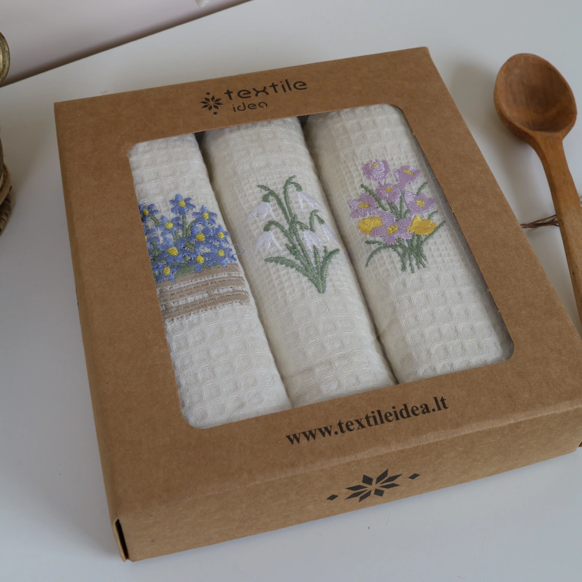 Virtuvinių rankšluosčių rinkinys Krokai sudaro 3 vnt. skirtingų to paties stiliaus rankšluosčių.