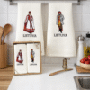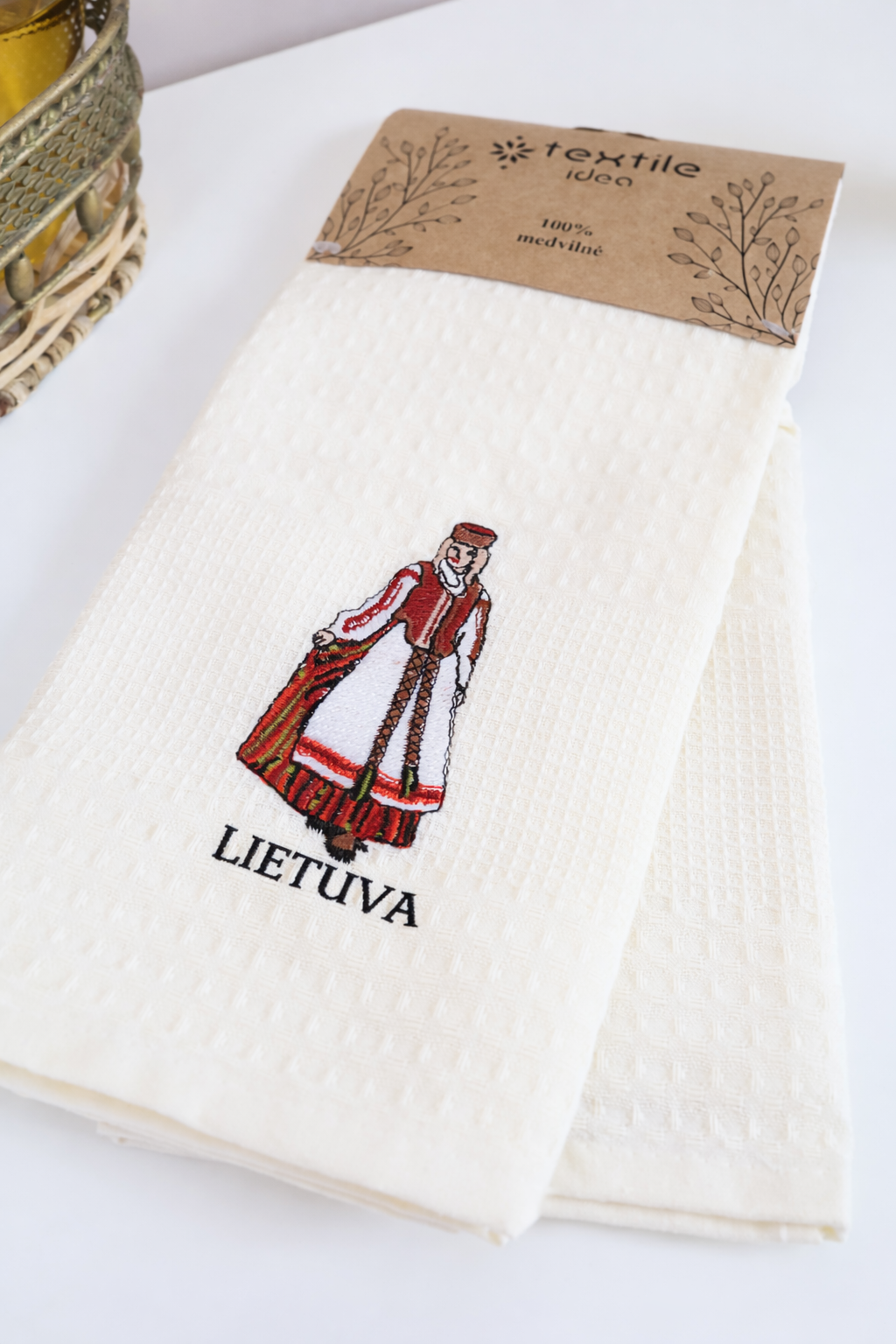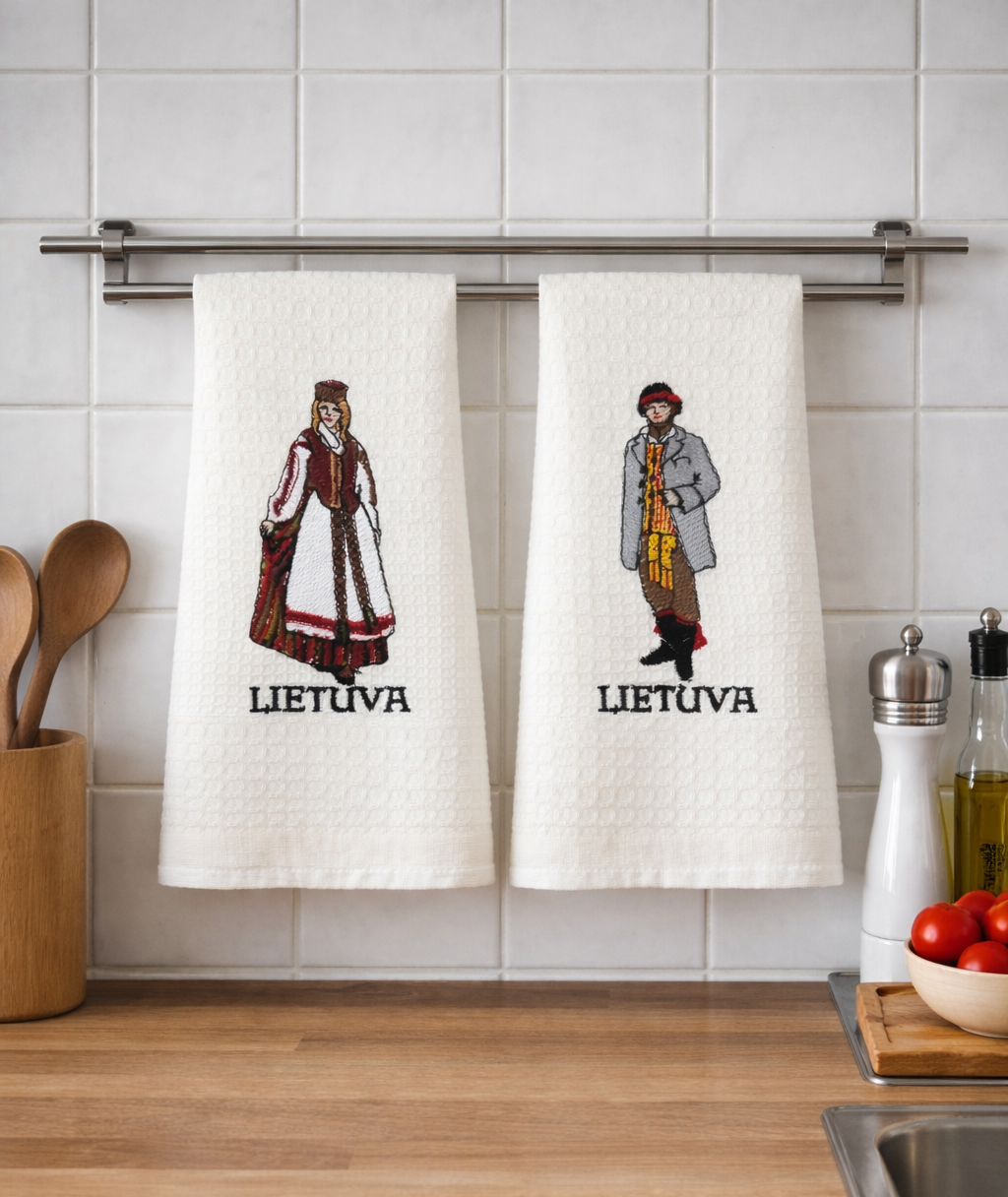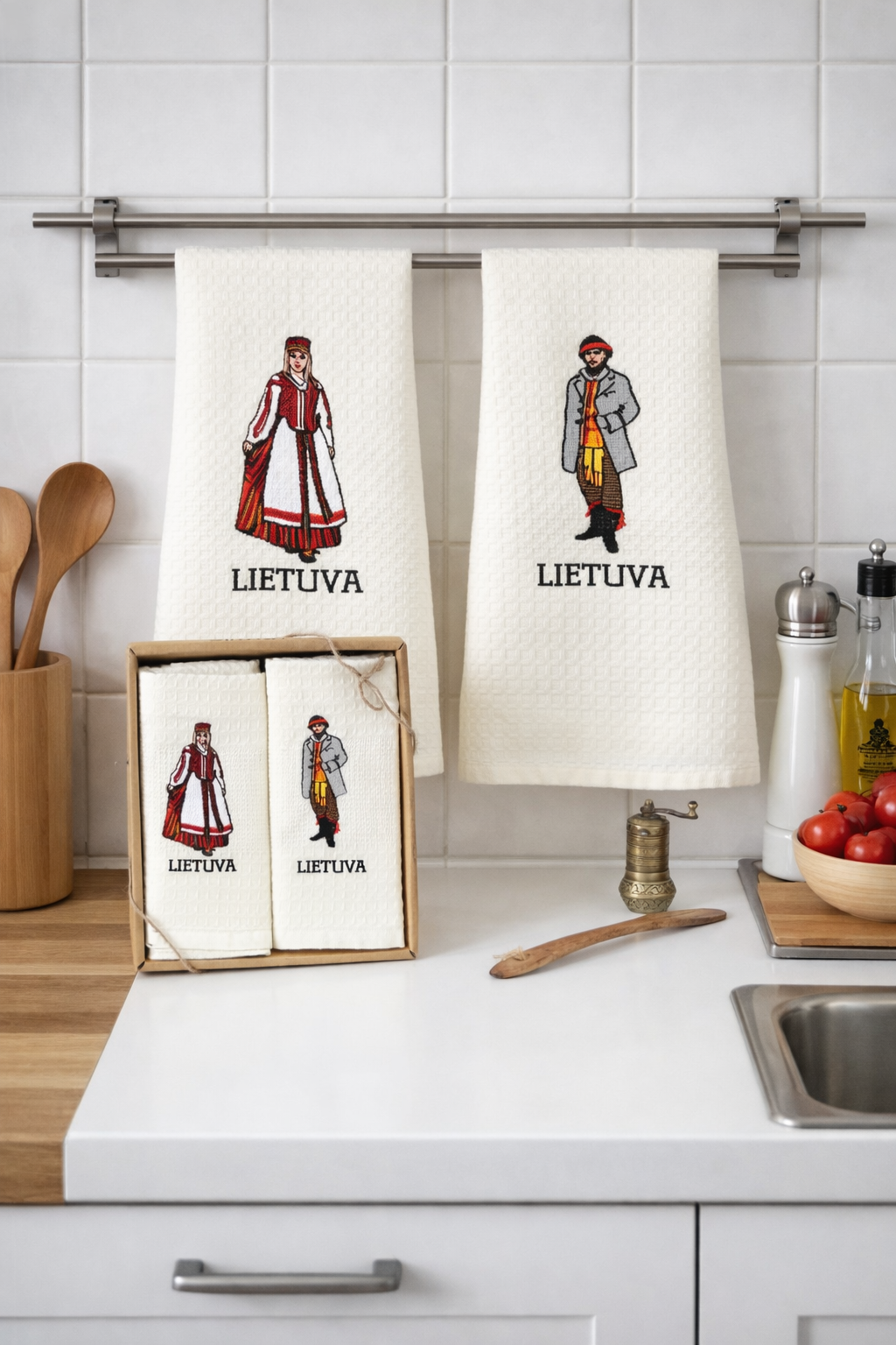Virtuvinių rankšluosčių rinkinys Lietuvaičiai sudaro 2 vnt. skirtingų to paties stiliaus rankšluosčių su lietuvaičiais ir užrašu Lietuva.