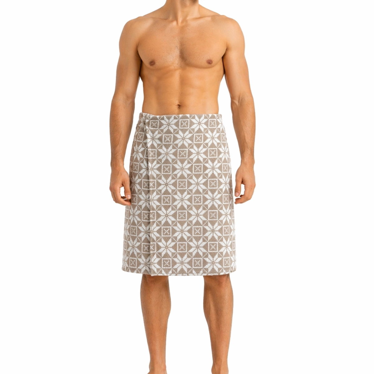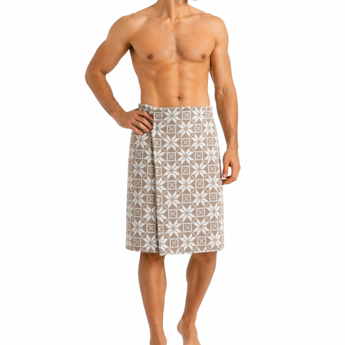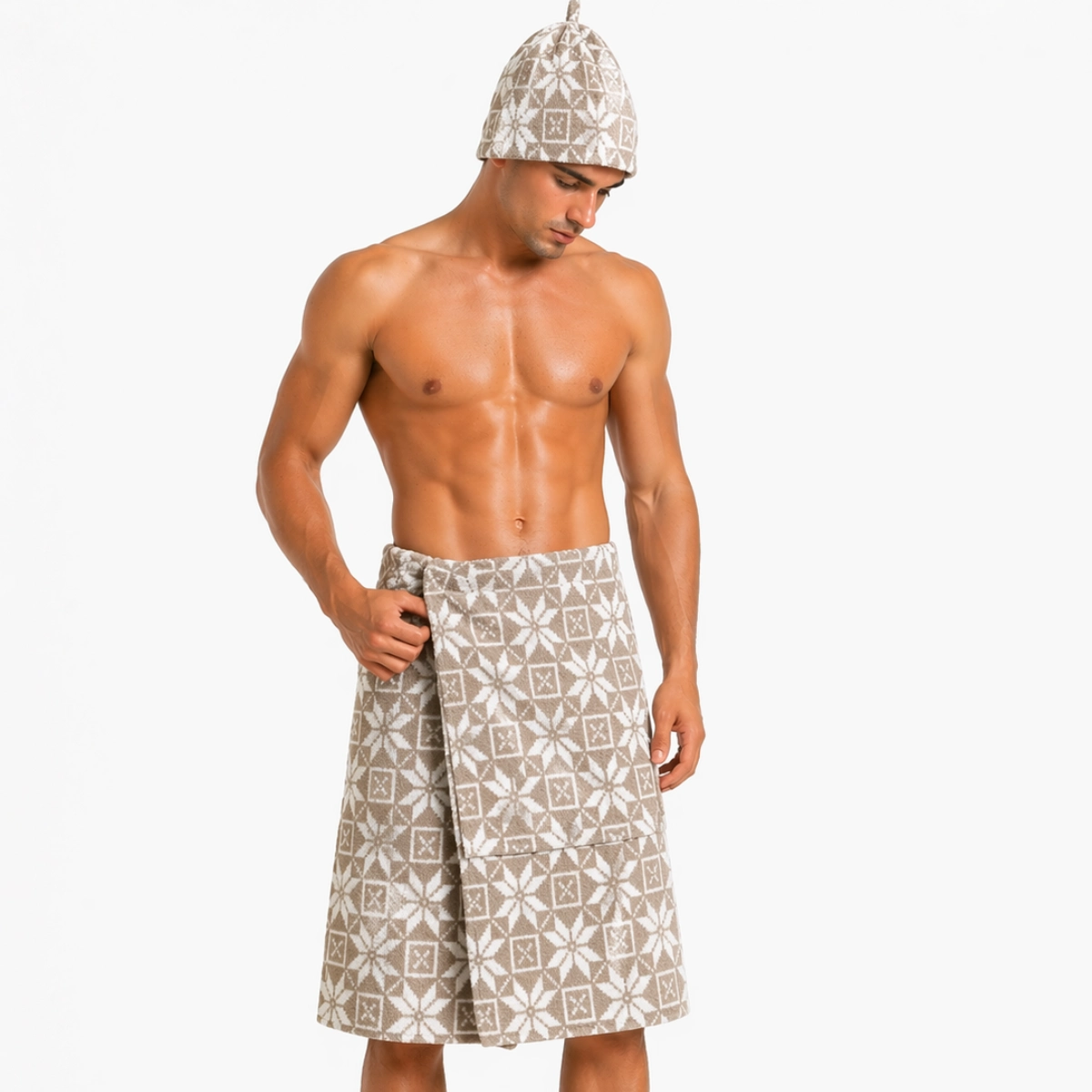 Medvilnės ir lino audinio pirties prijuostė Tautiniai raštai – skirta Jam, mėgstančiam pirtį, natūralumą ir patogumą. Susegama sagutėmis ties juosmeniu platesnės gumos pagalba reguliuojant plotį, ilgio iki kelių pirties prijuostė pasiūta siekiant maksimaliai suderinti naudingas audinio savybes ir patogumą nešioti. Ši pirties prijuostė: